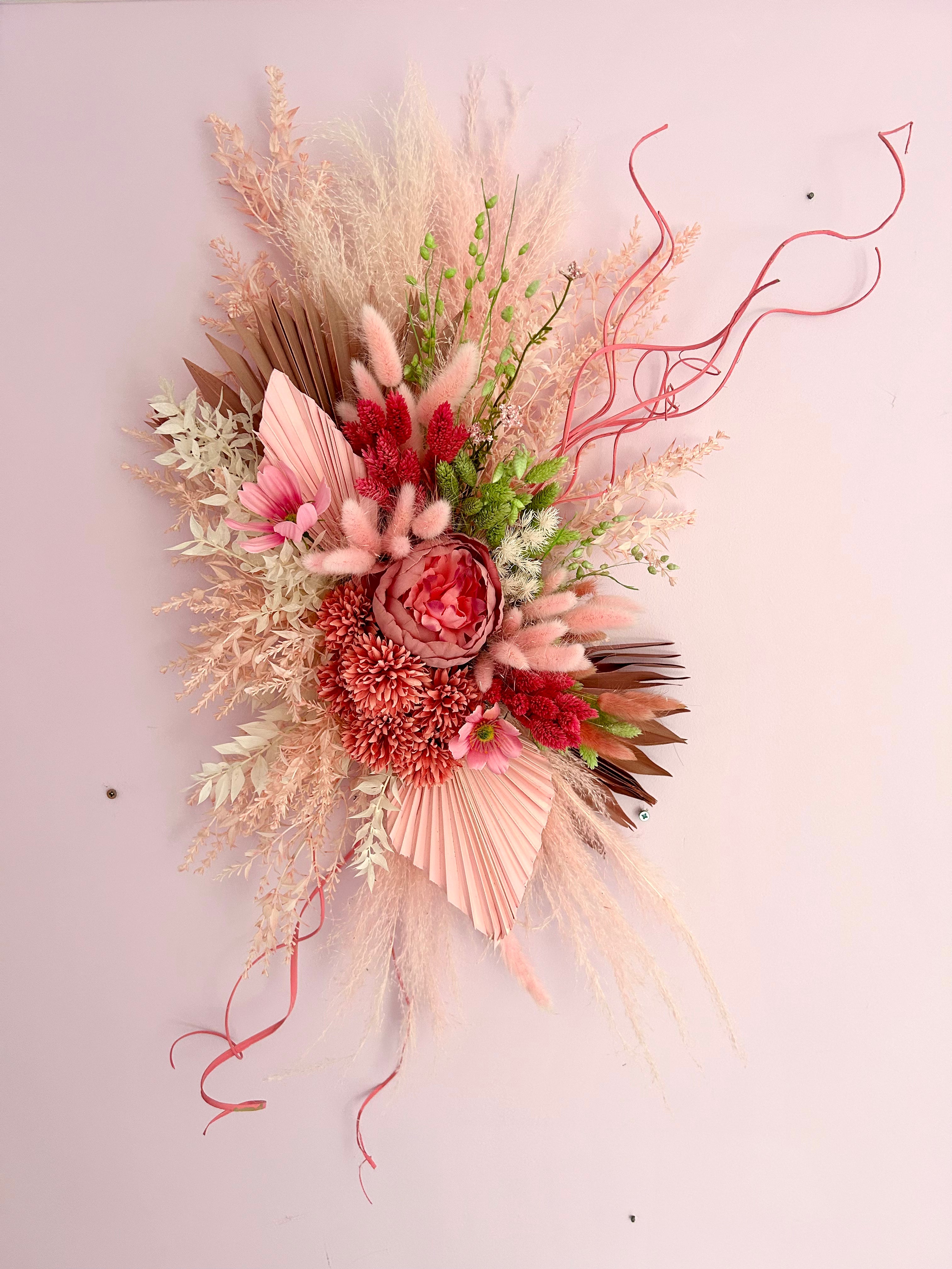 Beautiful hot pink pampas dried flower wall decor! Perfect for elevating your salon, clinic, or home decor. Use as a stand alone display or next to a logo sign, neon or mirror.