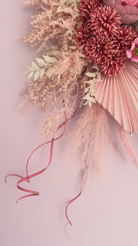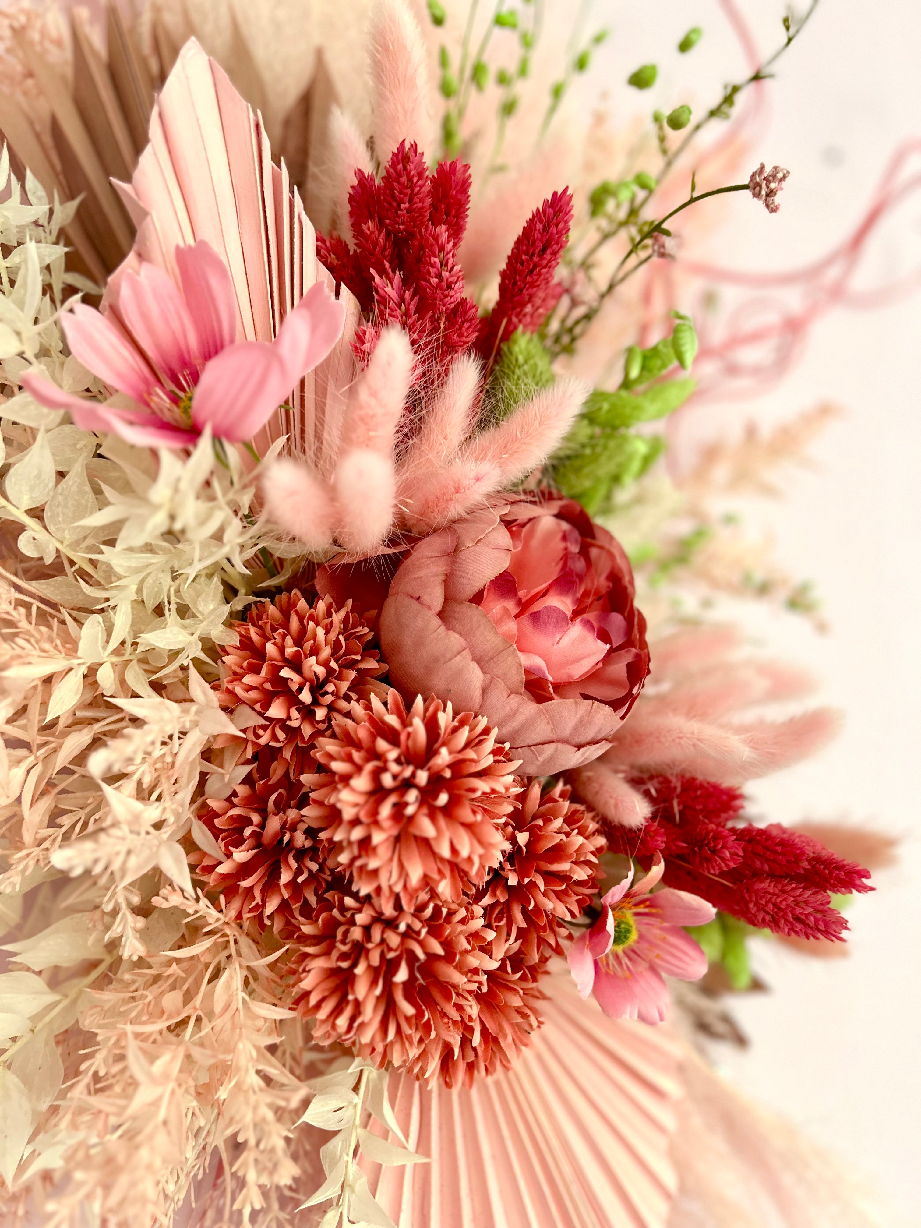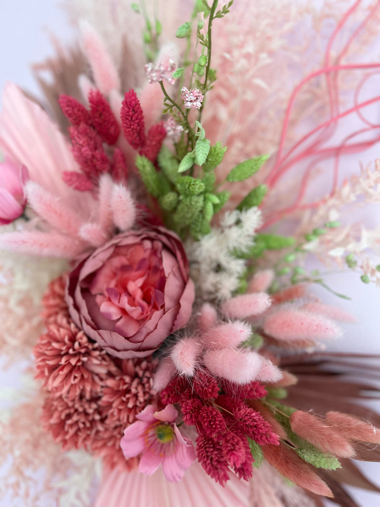 Fluffy pampas, dried and artificial flowers in pinks, green and natural tones.